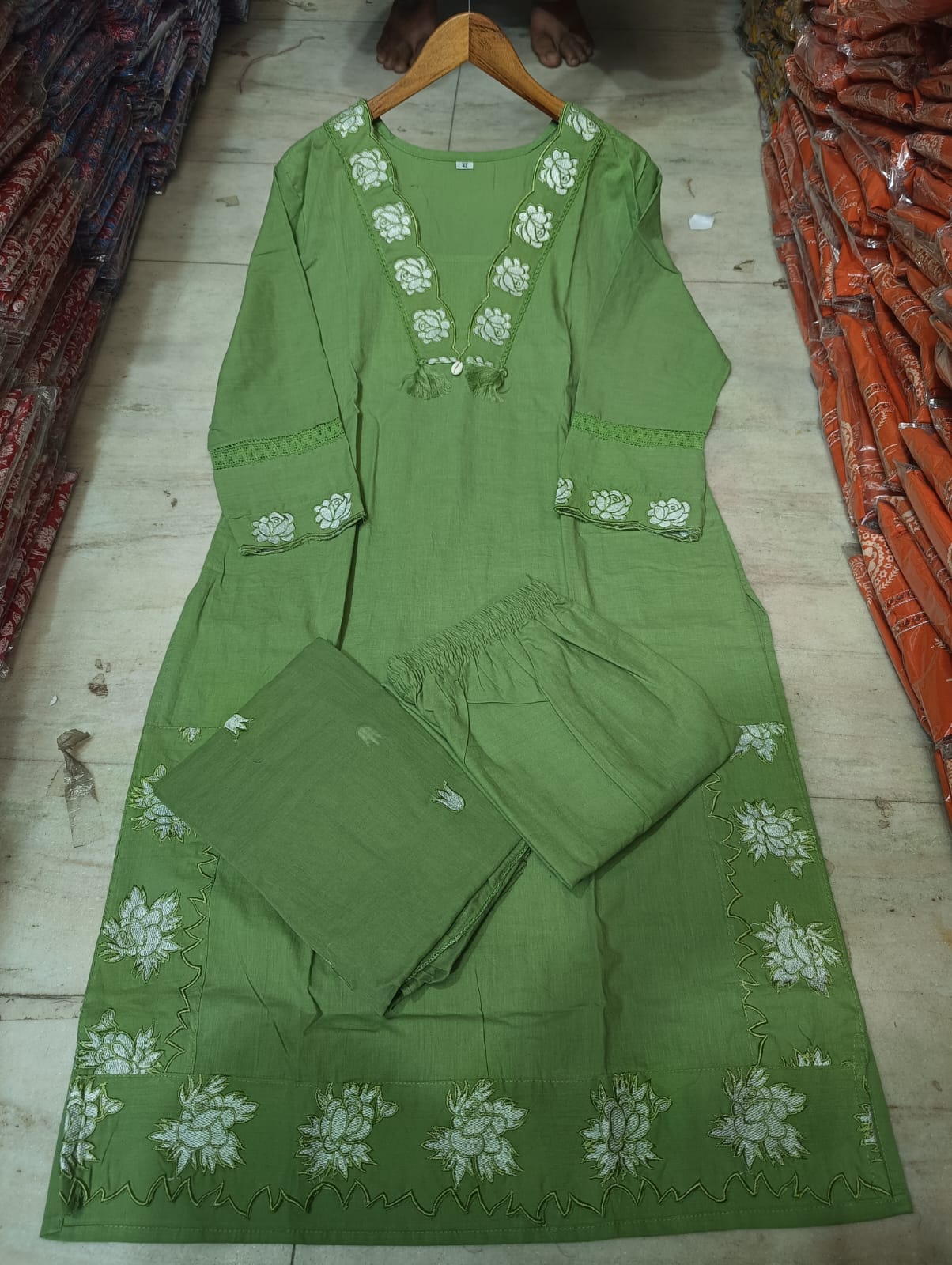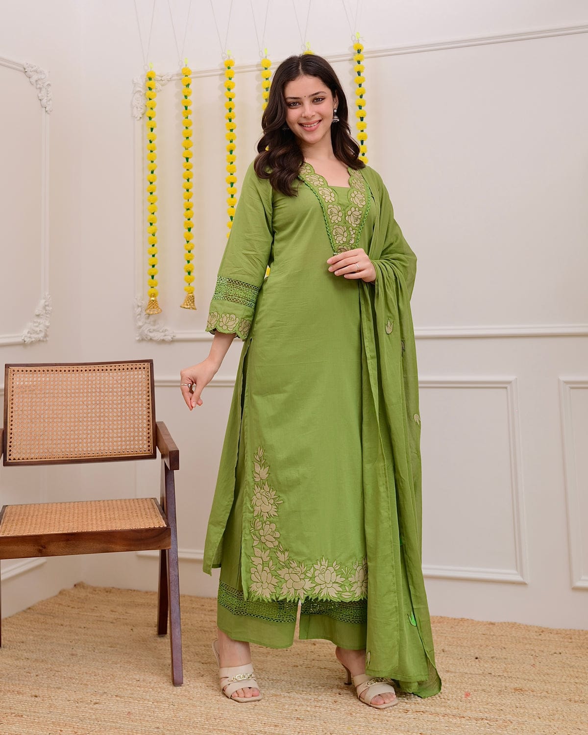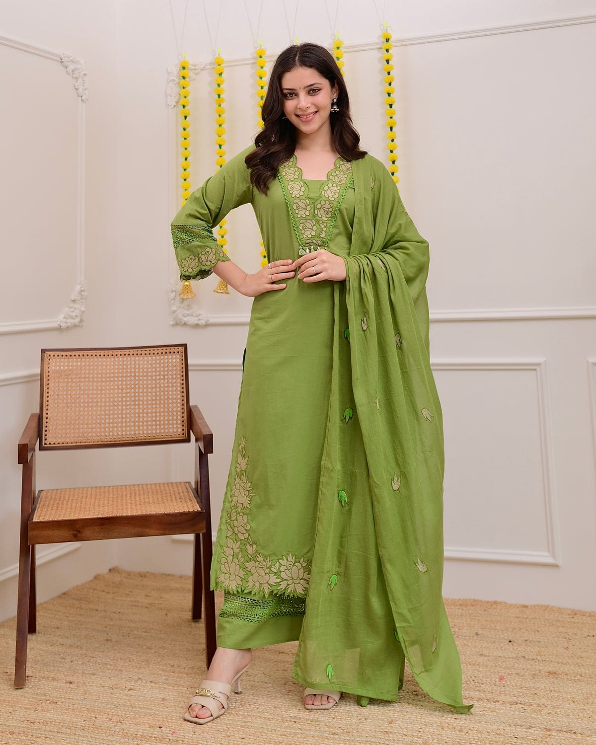 Olive Blossom Embroidered Straight Kurta Set