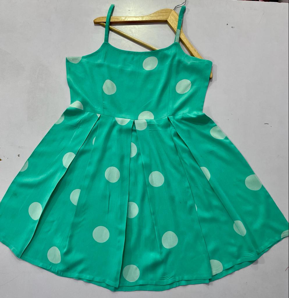Crafted from soft, breathable rayon, this dress features a cheerful polka dot pattern on a refreshing green base. The strappy neckline adds a fun, modern touch while keeping the look minimal and flattering. Its flared silhouette gives the dress a breezy movement, making it comfortable and stylish for all body types.